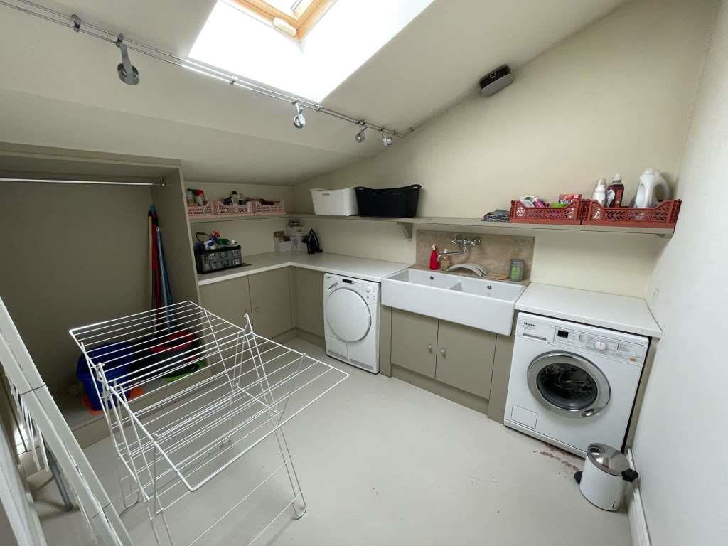A laundry room with washing machine, dryer and iron (on the top floor)