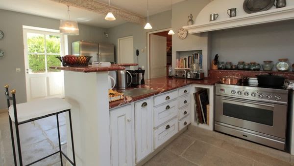 The entrance opens onto a small hall which serves a living room with its office, a dining room, and a fully equipped kitchen: oven and microwave, piano-type stove, refrigerators, freezer, dishwasher, washing machine and dryer. You will also have access to the summer dining room under the awning.