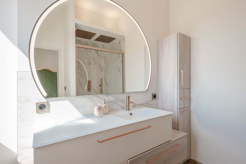 An en-suite bedroom with a 180×200 bed, a sink, a bathtub, and direct access to the outside.