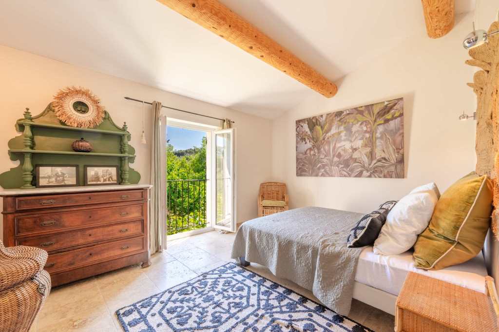 the Mas with two suites and two bedrooms, kitchen living room … overlooking the swimming pool, and the outbuilding with a bedroom, bathroom, living room, kitchen … overlooking a small communicating garden.