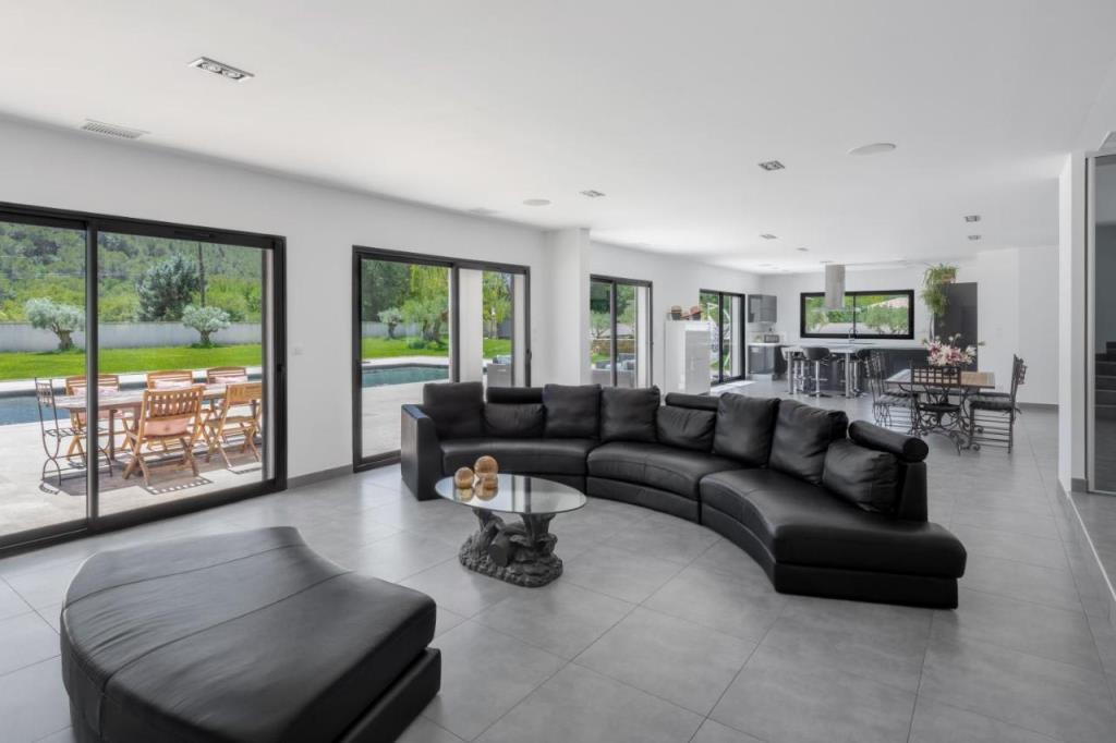 Large living room with large openings onto the garden and swimming pool
